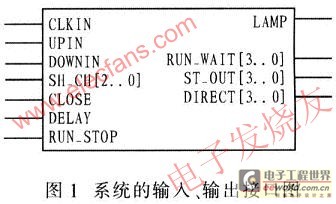 该系统采用单片CPLD器件实现一个多楼层单个载客箱的电梯控制器,该控制器可控制电梯完成 16个楼层的载客服务,而且遵循方向优先的原则,能够提前关电梯门和延迟关电梯门、提供电梯运行的开关控制键同时指示电梯运行情况、楼层间的运行时间以及电梯所在楼层的等待时间。根据系统设计要求,并考虑到系统设计的可验证性,整个系统的输入、输出接口设计如图1所示。