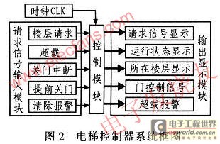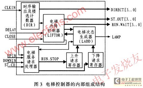 该设计中,电梯的控制状态包括运行状态、停止状态及等待状态,其中运行状态又包含向上和向下状态。主要动作有开、关门,停靠和启动。乘客可通过键入开、关门按钮,呼唤按钮,指定楼层按钮控制电梯。因此,整个电梯控制器应包括5个组成部分:时序输出及楼选计数器;电梯服务请求处理器;电梯升降控制器;上升及下降寄存器和电梯次态生成器,图2为电梯控制器系统框图。图3为电梯控制器的内部组成结构。