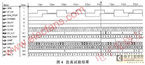 图4中,输入信号为:UPIN,ST_CH,RUN_STOP,DOWNIN,DELAY,CLOSE和CLKIN;输出信号为:ST_OUT, RUN_WAIT,LAMP,DIRECT,DIR,LIFTOR和WAI_T。当时钟上升沿到来时,若WAI_T=0,则它的下一状态为6;因 DELAY信号始终为低电平,故WAI_T依次自减1计数。RUN_WAIT是WAI_T和0的并置运算,故其值和WAI_T相同。