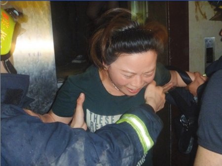 消防员手动拉升电梯,并使用破拆工具将电梯铁门撬开,将被困人员救出。