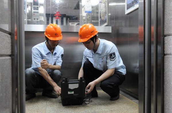 5月3日,福建省特检院工作人员在福州中山大厦检测电梯乘运质量。