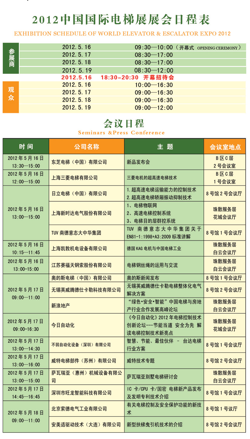 2012年5月16日-19日,中国国际电梯展览会在广州琶洲展馆举办,具体日程如表中所示,如需了解,可下载附件。