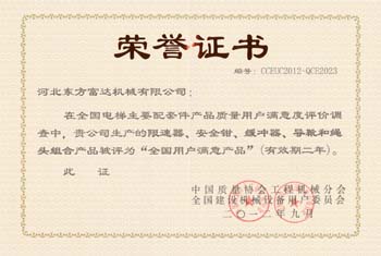 日前,2012年电梯整机和电梯配套件产品质量和服务质量用户满意度评价调查结果揭晓:河北东方富达机械有限公司又一次获得行业“用户满意服务明星”、“用户满意服务明星班组”、“用户满意杰出管理者”荣誉称号。这是中国质量协会、中华全国总工会、共青团中央、中华全国妇女联合会和全国用户满意工程联合推进办公室联合开展的,该活动为行业企业全面实施用户满意工程、提高整体服务质量水平,起到了积极的推动作用。