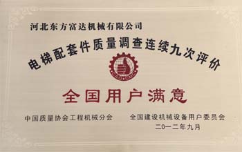 电梯整机和电梯配套件产品质量和服务质量用户满意度评价调查结果每两年向社会公布,作为用户选购产品的重要参考依据。自此项活动开展以来,河北东方富达机械有限公司每次都榜上有名,对于公司质量水平和服务水平的提高起到了积极作用。