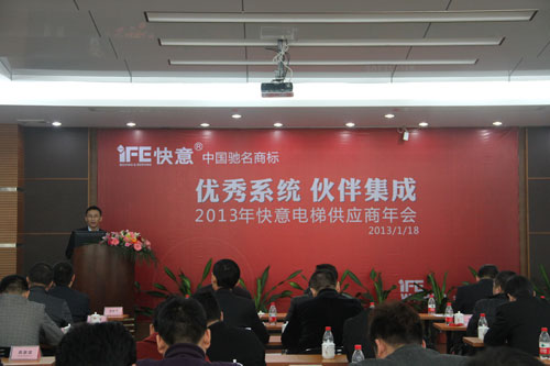 2013年元月18日,快意电梯2012供应商年会在东莞快意园区内盛大举行,来自全国的100余家供应商代表参加本次盛会,快意电梯总经理罗爱明先生、执行副总经理辛全忠先生、生产总监张毅先生及研发中心、供应部、技术部、质量管理部等负责人也出席了本次盛会。