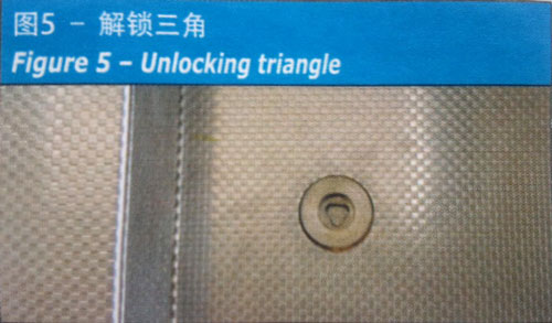 该装置含有一个名为解锁三角(图5) 的装置,此解锁装置一般位于自动门层门的上半部分,或者手动铰链门锁的旁边,通过使用三角形的钥匙,能够打开层门。