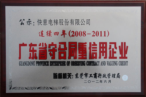 近日,经广东省工商行政管理局考核公示,快意电梯股份有限公司再度被授予“广东省守合同重信用企业”的荣誉称号,至此,快意已连续四年获此殊荣。