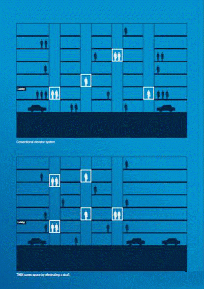 此外,TWIN双子系统还可以在客流量较少时关闭其中一台轿厢,从而节省能源,极大地降低大楼整个使用期的运营成本。