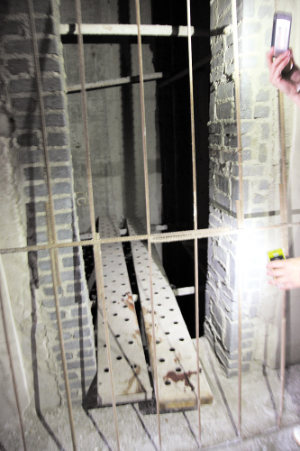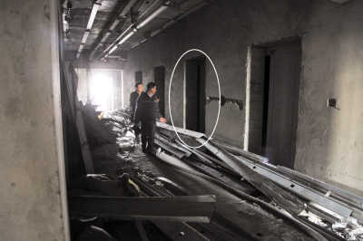 在死者死亡的16层,一摊已经干涸的血迹触目惊心,该层的电梯没有安门,施工方用钢筋将门口封死。记者又上到了37层,眼前的情景与陈某描述的一样。电梯门紧闭,门前堆着1米多高的铁板。记者注意到,37层以下几乎只有这一层的电梯间安上了门,其他均没有安装电梯门。