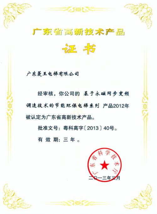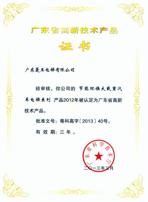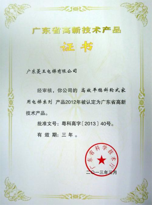2013年3月,广东菱王电梯有限公司的“高效平稳斜轮式家用电梯系列”、“节能环保大载重汽车电梯系列”和“基于永磁同步变频调速技术的节能环保电梯系列”产品攻克前沿科技瓶颈,以其高效率、高性能、高品质的节能环保创新性得到了广东省科学技术厅的肯定,被认定为“广东省高新技术产品”。