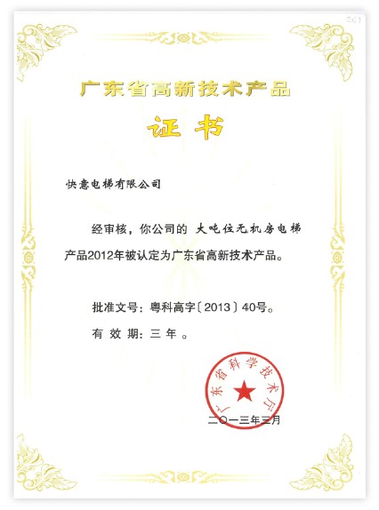 近日,经东莞市科技局审查、广东省科技厅专家评审,快意电梯高新技术产品行列又添新成员,IFE快意大吨位无机房电梯产品被认定为“广东省高新技术产品”,此前,快意高速电梯已于2011年获得“广东省高新技术产品”殊荣。