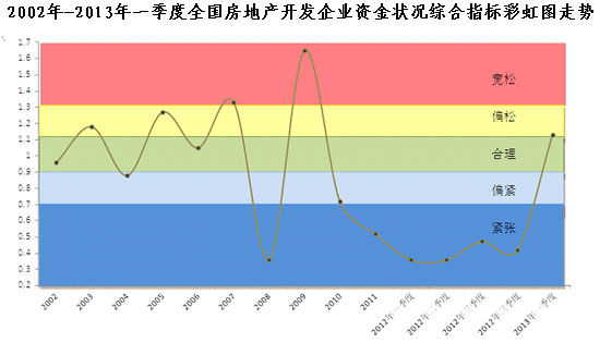 上海易居房地产研究院5月22日发布了《2013年一季度全国房企资金报告》。报告指出:2013年一季度,全国房地产开发企业资金状况为偏松,这是自2010年三季度以来, 房地产开发企业资金首次告别紧张状态(其中2010年三四季度为偏紧状态,2011年至2012年八个季度均为紧张状态)步入“偏松”区间。