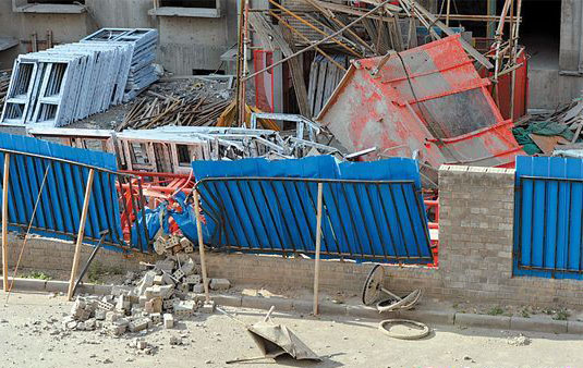 从现场情况看,电梯厢坠落下来后,不仅砸中了一段三米长的彩板围墙,电梯钢构架也歪了,一截钢构架也随之掉落下来。