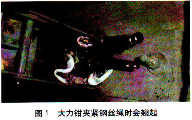 实践证明:用该大力钳夹紧两种常见的不同型号规 格、均为对夹紧力要求较大的31层站电梯的限速器钢50mm、直径为8mm的螺栓(图2中的2),以保证夹持 钢丝绳时,大力钳处于水平稳定状态。 丝绳,可方便、可靠地将其夹紧,从而取下钢丝绳(如 图3所示)。