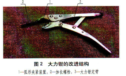 通过了解发现,现有市面上销售的大力钳通常选用 的材料是优质A3钢,其焊接性能较好,因此,针对本 文第2.3节中第(1)、(2)点提到的问题,笔者取用内径 为12mm、厚度为2.5mm的膨胀螺栓套的部分材料(图 2中的1)作为弧形夹紧装置焊接在大力钳钳刀口上。 焊接时夹住8mm直径的螺栓进行焊接,以保证其制作 精度。针对该大力钳钳口中心与其前端的距离较小的情 况,笔者在大力钳定臂(图2中的3)前端焊接一段长为