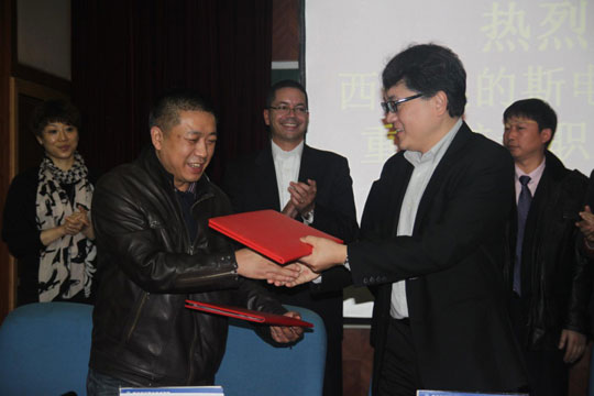 西子奥的斯人力资源及行政部部长区志聪(右)与重庆航天职业技术学院校领导交换文件
