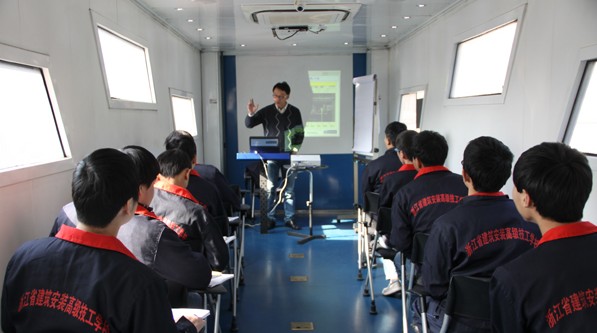 2013年11月26日上午,在浙江省建筑安装高级技工学校的正大门广场上停放着一辆“体型”庞大的电梯培训车,吸引了学校师生驻足观看,这是世界五百强企业蒂森克虏伯电梯(中国)培训车首次来到浙江,驶入浙江省建筑安装高级技工学校。接下来,在蒂森克虏伯电梯公司培训讲师王老师的带领和讲解下,公司将为学校电梯安装与维修专业的学生和教师们提供为期8天的参观指导和技术培训。
