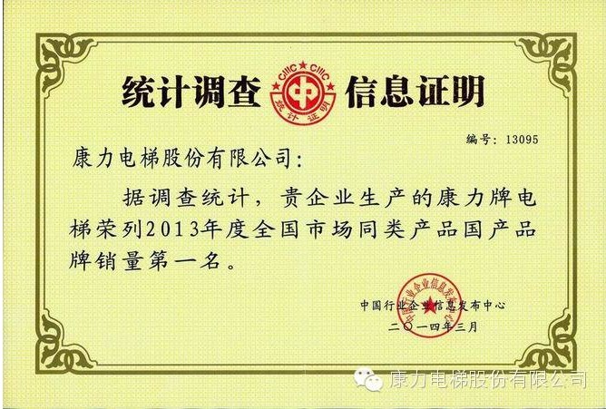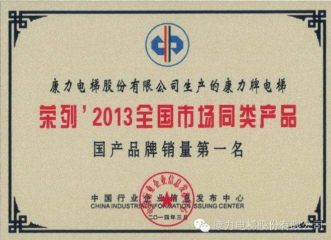 2014年3月,国内权威市场调研机构--全国行业企业信息发布中心(CIIIC)公布了2013年度统计调查数据:康力电梯股份有限公司生产的“康力”牌电梯荣列2013全国市场同类产品国产品牌销量第一名,自2005年起,康力已连续九年稳居该项统计数据第一名。