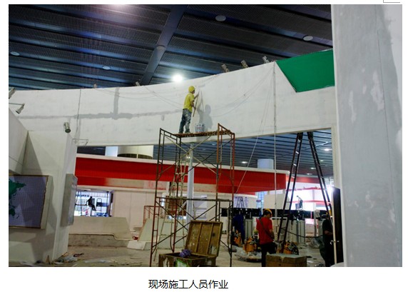 施工现场,搭建工作虽然正在紧锣密鼓的进行中,但现场秩序有条不紊。工人作业均在各自展台范围之内,为施工叉车、设备进出让出主通道。