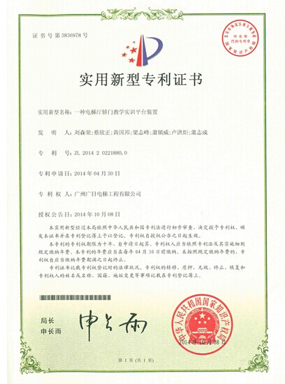 广州广日电梯公司实用新型专利“一种电梯厅轿门教学实训平置”(ZL201420221880.0)、“一种无机房电梯轿底维修专用工具” (ZL201420219848.9)已获得国家知识产权局授权。