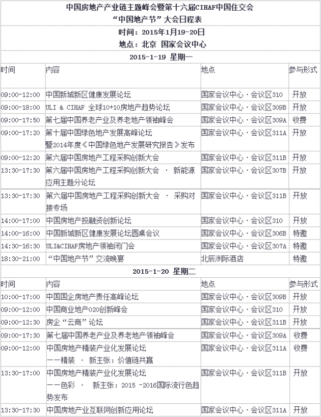 据凤凰房产记者了解,凭借深入探讨中国房地产行业的热点话题,引导行业发展终极风向的会议主旨,本届住交会吸引了国内外房地产意见领袖、行业精英、上下游企业、主流媒体来共同参与,已然成为2015年新春开年的一场地产盛会。目前,CIHAF第16届中国住交会已经进入开幕倒计时状态,凤凰房产记者则第一时间获取了本届“中国地产节”的全部会议安排,欢迎地产各界精英人士和行业从业人员在1月19日-20日两天内前往国家会议中心,共同参与本次地产届的思想盛宴。