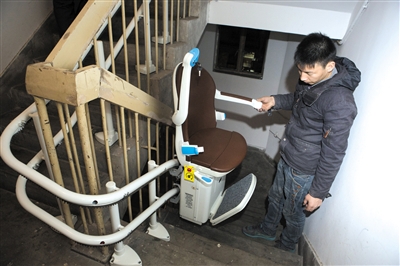 坐着一把软皮椅,右手轻轻拨动开关,不用费力,就可从一楼上到五楼。昨日,北京市首部由居民自发筹资的“坐椅式”电梯,在东城区东花市北里小区安装。这部电梯前后共花费16万,可载重137公斤,可有效解决该单元多名老人上下楼难的问题。