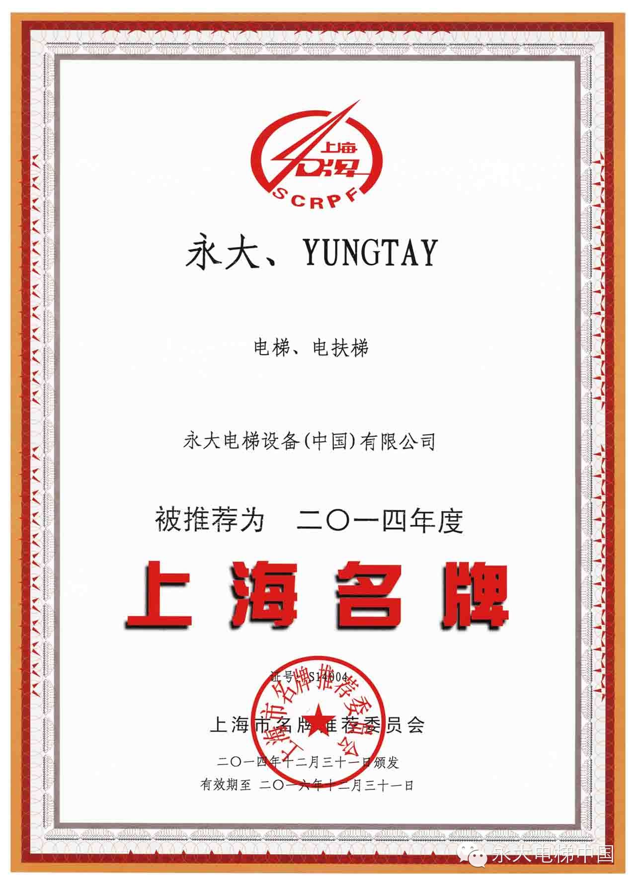2014年12月31日,“上海市名牌推荐委员会通告”在《解放日报》进行公示,共有411项产品、173项服务和6项明日之星上榜,永大电梯成为唯一获得“上海名牌”称号的电梯及电扶梯制造企业。