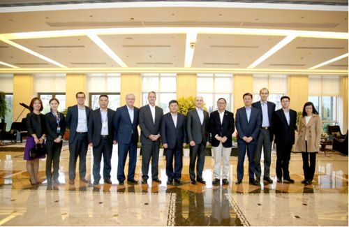 (图片:杭州西奥电梯总裁周俊良先生(左二)热情接待美国联合技术建筑与工业系统全球总裁Geraud Darnis先生(左三)、中国区总裁郑培明先生(右一))