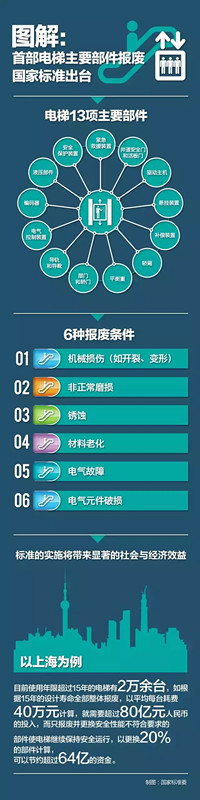 该标准由我国自主研制,目前国际上尚无相关的国际标准,发达国家也无相关标准。该标准填补了多年来国内外电梯行业缺少电梯报废相关标准的空白,新标准将于明年2月1日起正式实施。