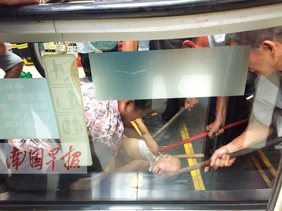7月27日上午,梧州市太阳广场内,一名不满两岁的小孩被手扶电梯夹住,左臂被卷入电梯。当晚,伤者被送到南宁进行手术。图为众人在营救被夹的小孩。