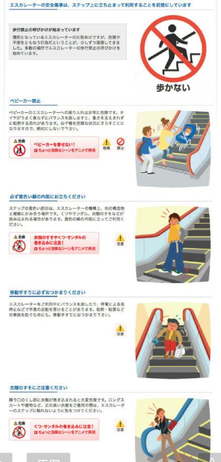 日本电梯协会从1973年开始就呼吁人们避免在扶梯上行走、推婴儿车,必须站在黄线以内,特别是注意衣服鞋子不要被卷入扶梯。日本政府还呼吁电梯的管理者在入口、出口处摆放安全警示,反复播放广播提醒乘客注意安全。