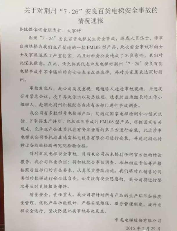 对于此次电梯安全事故,申龙电梯股份有限公司目前尚未接到任何官方性的结论报告。但是申龙电梯承若:将积极配合事故调查、承担相应责任并严格按照质监部门的有关要求,认真落实整改措施。对于已销售的同类型电扶梯,他们将进行安全性自查,如发现有安全隐患的,公司将进行整改并及时更换相关部件。