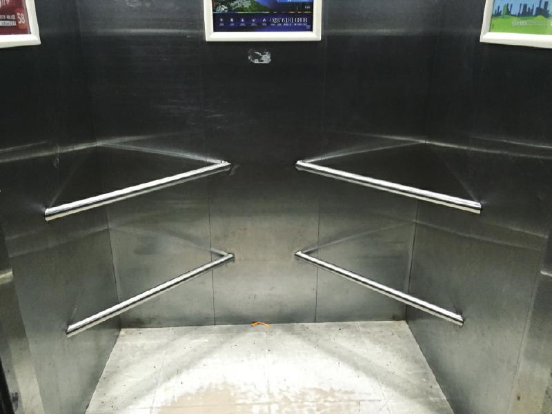 8月6日,在锦绣东方小区看到,小区各单元的电梯最里端两个角落,均被焊接上了四根不锈钢条,在电梯内呈“八”字形分布。