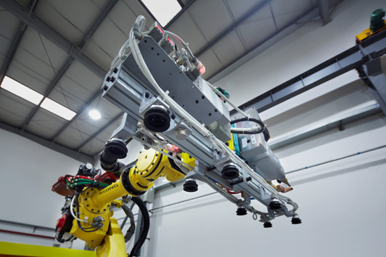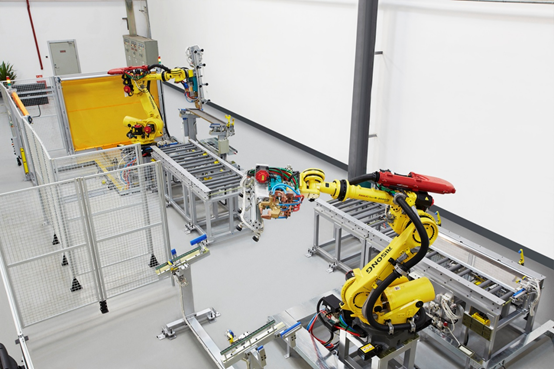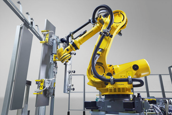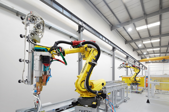 ——瑞松科技首先针对原有的层门板抽铆固定工艺进行了改良,采用电阻压力焊接方法,实现了冲孔工序简化,提升了折弯前工序的效率,还减少了抽铆的不锈钢铆钉的使用,实现了制造成本的递减,自动化提升上使用高柔性伺服6关节210KG机器人安装了伺服加压中频1200HZ的点焊钳和自动抽真空抓手及其自适应的中频焊接控制器,采用了高清晰2D影像系统,保证每个工件的抓料准确性和工件种类自动识别功能,实现了整个电梯层门在折弯后取件、定位、点焊、码垛、出料工序的完全自动化;为了保证每个焊接点的抗疲劳强度和产品更高的安全可靠性,采用了自适应焊接控制系,并实现了无飞溅的焊接。