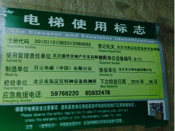 “平时做电梯的时候,电梯有时会发出异响,可是没想到,竟然会下滑。”小殷回忆道,第一次遇到“滑梯”时电梯中有6、7个女生,随着一声异响,身体明显感觉到向下坠落,“当时大概是在14层,电梯突然下坠,引来一阵尖叫声,有人赶紧把下面的几层的按钮都按上,紧接着电梯停到了12层。大家慌乱的逃出去,换乘别的电梯,有些人直接从12楼走了下去。”发现,电梯使用标志显示,该电梯的制造单位为日立电梯(中国)有限公司,且电梯已过检验日期。