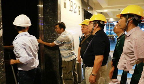 省特检院机电一部部长王河、副部长尹海东,环球中心电梯维保公司、物业公司、使用单位负责人陪同检查。