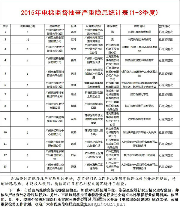 广州市质监局在日前发布的前三季度广州电梯监督抽查情况中,指出有13家电梯使用单位41台电梯存在严重安全隐患。