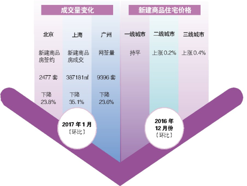 国家统计局70个大中城市住宅销售价格统计数据显示,2016年12月份有46座城市新建商品住宅价格环比上涨,2016年11月份为55座城市上涨,价格环比上涨的城市个数在减少。其中一线城市新建商品住宅价格环比由上月的上涨0.1%转为持平;二线城市新建商品住宅价格上涨0.2%,比上月回落0.2个百分点;三线城市新建商品住宅价格上涨0.4%,比上月回落0.4个百分点。15个一线和热点二线城市因地制宜、因城施策实施调控政策以来,政策效果明显,房价快速趋稳回落。其中广州市已连续三个月环比涨幅回落。
