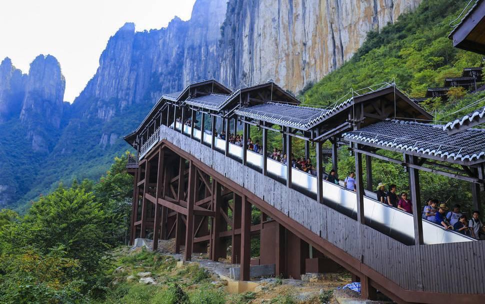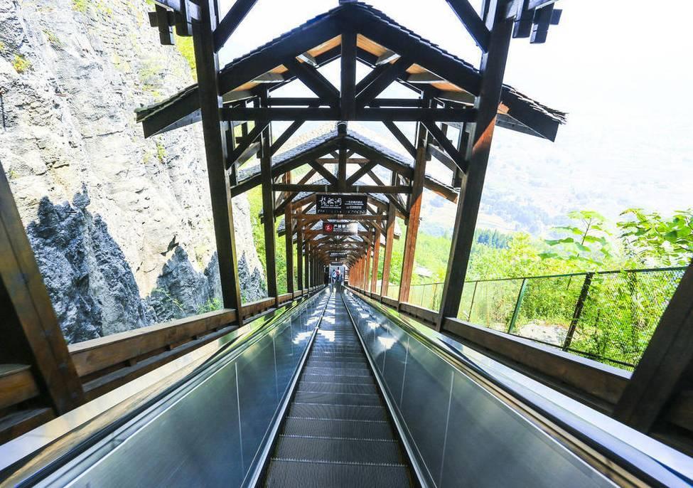 世界超长688米环山电梯来了会玩的人绝对不能错过。688米超长旅游观光手扶梯,电梯修建于国家4A级景区恩施大峡谷七星寨景区。起于大楼门,止于甘堰塘返程中心,电梯全长688米是一座旅游观光型的户外手扶电梯。整座电梯依山势而建,呈“∑”形布置,远观如山野卧苍龙,气势贯如虹。该电梯采用钢筋砼框架结构加木结构,海拔高度从1228米升至1428米,提升垂直高度200米,构成游客快速下山通道。工程设计充分考虑施工与生态保护和谐共存的理念,电梯上部结构选用原木建成。顶部采取土家风格的青瓦盖顶,周围种植大量攀藤植物,远远看去与恩施大峡谷鬼斧神工的自然景观融为一体。沿着电梯一路坐下来,恩施大峡谷的美景一览无余。