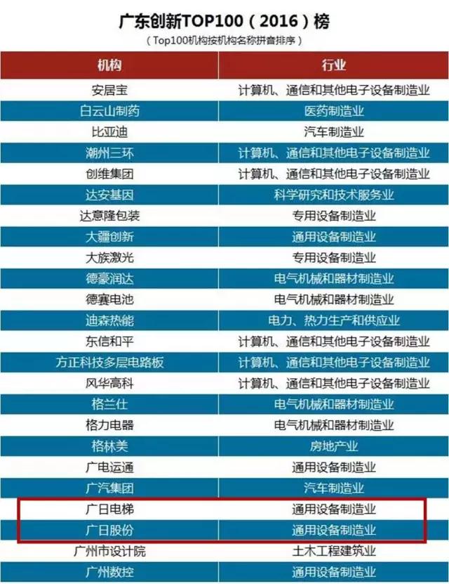 2017年2月21日,广州日报数据和数字化研究院(英文简称GDI)基于专利总量、专利授权率、全球化、影响力和成长性五个要素,对广东创新机构进行了科学评价,广日电梯及广日股份凭借创新实力双双荣登“广东创新TOP100(2016)榜”。本次所采用的数据主要来源于科睿唯安,广东省知识产权局,评选结果具有权威性。其中,专利总量作为衡量机构创新能力的重要指标,评价过程把近5年至少拥有40件被授权的新专利作为进入评选范围机构的准入条件。
