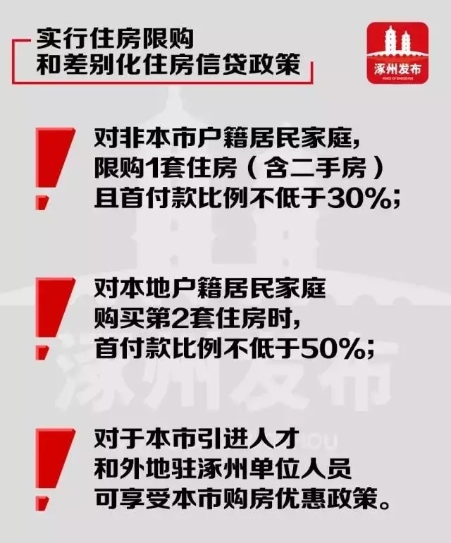 该实施意见显示,涿州将实行住房限购和差别化住房信贷政策。对非本市户籍居民家庭,限购1套住房(含二手房)且首付款比例不低于30%;对本地户籍居民家庭购买第2套住房时,首付款比例不低于50%;对于本市引进人才和外地驻涿州单位人员可享受本市购房优惠政策。
