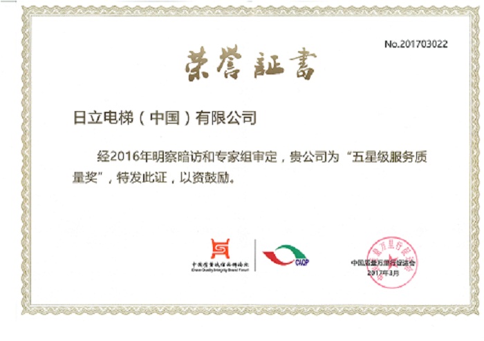 3月12日,由国家质检总局指导、中国质量万里行促进会主办的315第三届中国质量诚信品牌论坛在北京举办。论坛对中国服务创新奖、全国质量诚信品牌示范企业、五星级服务质量奖和用户满意服务诚信鼎的获奖企业进行了表彰。日立电梯从众多企业中脱颖而出,再次被授予“五星级服务质量奖”,成为了目前中国电梯行业中唯一一家获此殊荣并连续两次获得该奖项的企业。