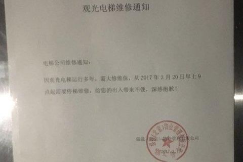 随后,记者赶到事发现场,发现故障电梯门上已贴上维修通知:“因观光电梯运行多年,需大量维保,3月20日起停梯维修。”张贴时间为3月17日,通知方是强强(北京)物业管理有限公司。