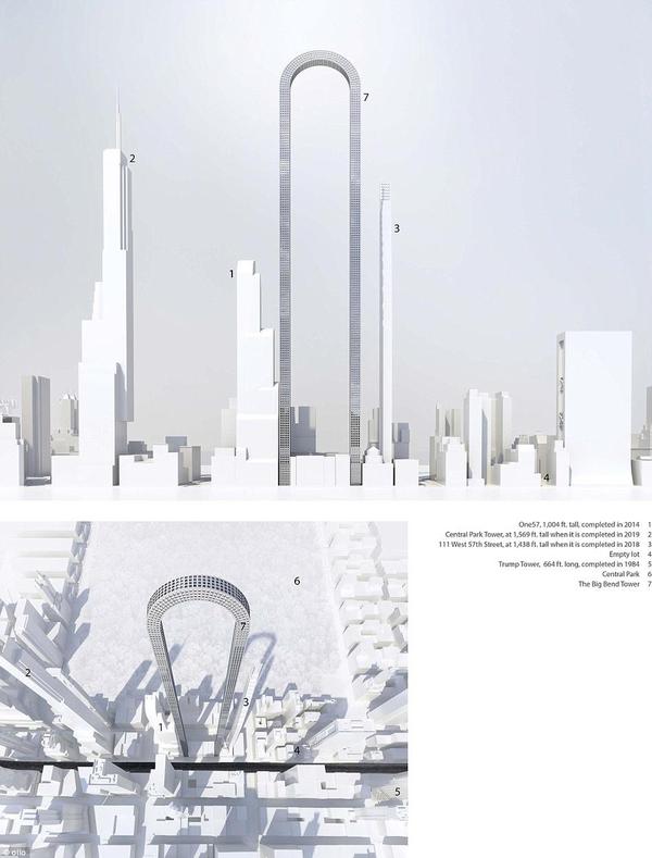 该“U”型建筑横跨纽约最昂贵地段第57大街。此前,Oiio工作室解释说:“纽约区划法创造了一套特殊法则,促使开发商不断通过建造高楼来提高自己的声望。但是如果我们用长度取代高度呢?那么我们就只能改变建筑的结构,在曼哈顿建造一个世界上最长的建筑。”