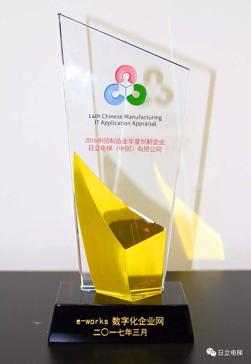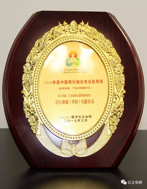 2017年3月16-17日,主题为“互联网与工业的深度融合之道”的“2017(第六届)中国信息化和工业化融合发展高峰论坛”在北京举办。本次高峰论坛还举行了“第十四届中国两化融合岁末盘点颁奖典礼”,日立电梯(中国)有限公司荣获“2016中国制造业年度创新企业奖”及“2016年度中国两化融合杰出应用奖”两大奖项。