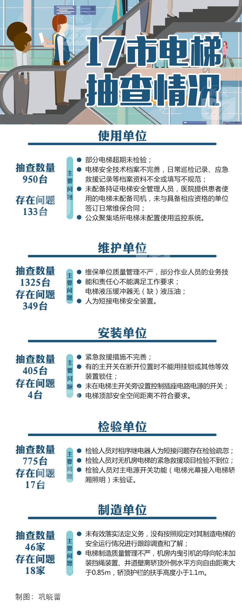 去年全年对新安装电梯和在用电梯的施工质量、检验质量、维护保养质量、使用管理质量“四个环节”进行了随机抽查,共监督抽查全省17市的46家电梯制造单位、190家电梯使用单位、262家电梯维保单位、87家电梯安装单位和18家电梯检验机构的2100台(其中在用电梯1695台、新安装电梯405台),发现存在不符合相关安全技术规范问题的电梯366台。