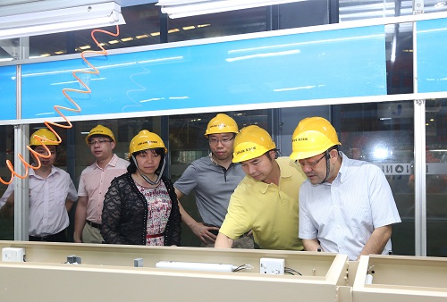 在智能化生产车间,顾区长一行走进井然有序的生产线,不禁感叹道:菱王走智能化生产路线,不仅可以减少人力的投入,而且智能化机械生产出来的产品,其精准度也有一定的保障。在菱王试验塔,顾耀辉区长一行还亲身体验了8m/s的超高速电梯与4m/s的观光电梯。