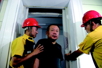 现场情景模拟中,业主乘坐电梯上行,到达2楼时,因电梯突发故障被困。被困业主通过电梯内的求救电话向物业值班室求救。救援人员迅速赶到现场后,在安抚两位业主情绪的同时启动应急预案,通过控制室顺利盘车、平层等操作,最终用三角钥匙将电梯门打开,5分钟内“救”出被困业主。