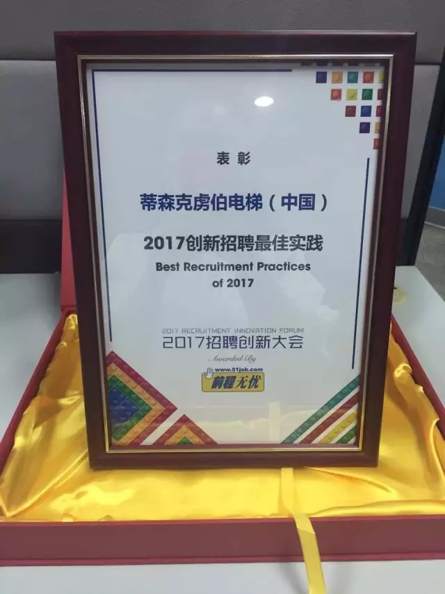 此次,蒂森克虏伯电梯(中国)人力资源团队凭借“菁兵训练营项目”在新生代人才吸引、招聘渠道与流程创新、雇主品牌塑造等诸多创新举措,从众多企业中脱颖而出最终荣获前程无忧“2017创新招聘最佳实践案例”殊荣。
