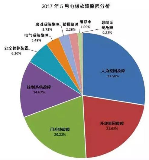 2017年5月,按故障类别统计的故障原因中,“人为原因故障”“外部原因”“门系统”三类原因分别列前三位,分别占比27.50%、21.63%、20.22%,共占总处置量的69.35%。